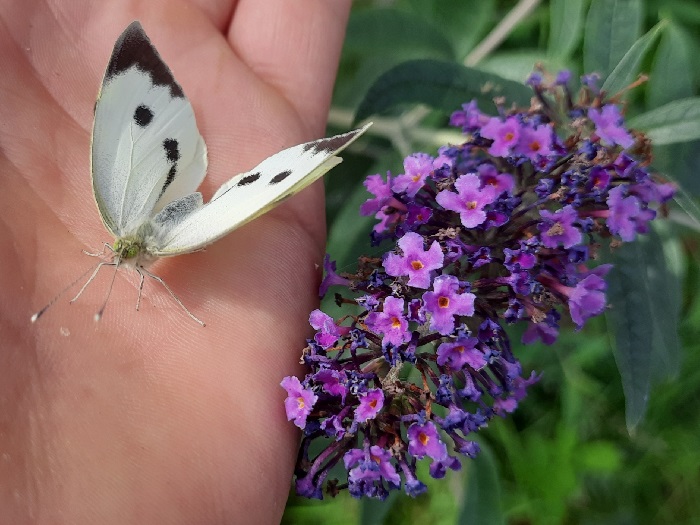 14 augustus 2023: Dit groot koolwitje had meer belangstelling voor de hand van de fotograaf dan voor de bloeiende vlinderstruik.