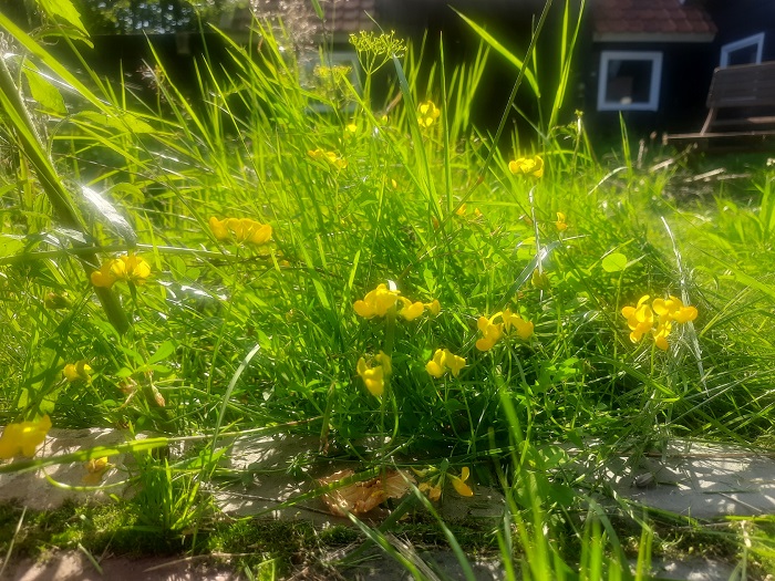 10 augustus 2023: Rode klaver en witte klaver zijn overal op het terrein te vinden, maar de gele variant rolklaver bloeit nu pal voor de Stallen.