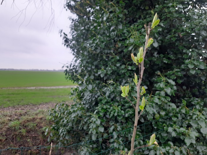 7 februari 2024: In de boomgaard zijn vier kweeperen geplant, geoogst uit het opschot van een boom in de boomgaard van een naburige boerderij.