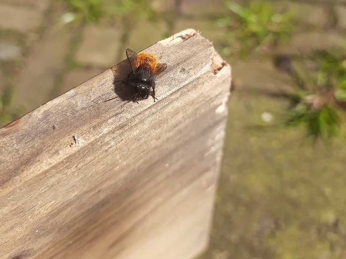 23 maart 2024: Een gehoorde metselbij op een houten plank. De bestuiving van de fruitbomen in de boomgaard is in goede handen.