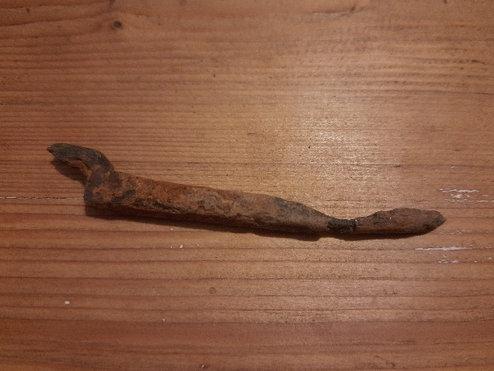 18 maart 2025: Bij het boren van een gat voor een paaltje kwam van een armlengte diep in de grond dit ijzeren voorwerp tevoorschijn. Op een schervenavond van de archeologische vereniging Archeo-Altena is gespeculeerd over de functie en ouderdom, een 19e-eeuws landbouwinstrument, een 17e-eeuwse speld?