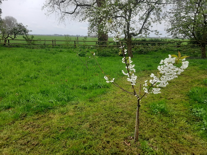 22 april 2025: Hoe jong ook, de nieuwe appelboompjes bloeien volop.